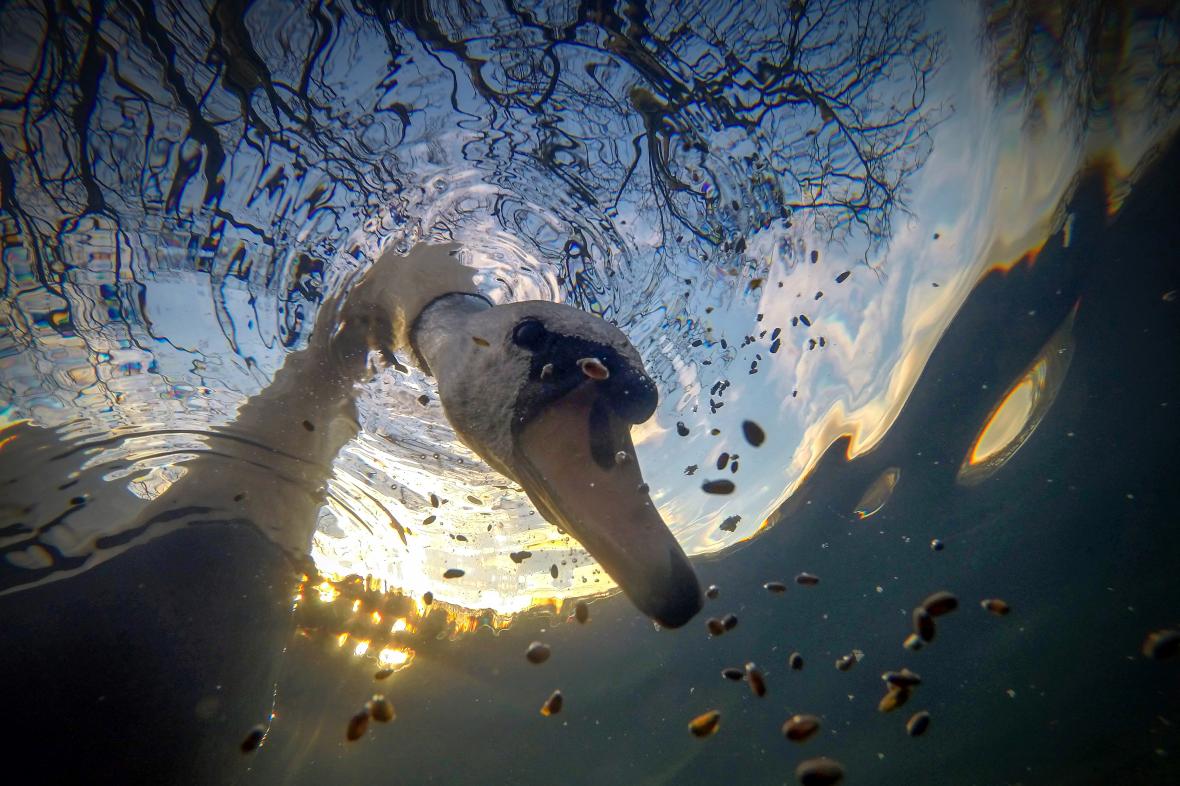 Tην πρώτη θέση στην κατηγορία «Βρετανικά Νερά» κέρδισε η φωτογραφία ενός βουβόκυκνου που βουτά το κεφάλι του μέσα στο νερό για να βρει τροφή. Ο Ίαν Γουέιντ συνέδεσε μια κάμερα GoPro με το κινητό του τηλέφωνο και στην συνέχεια την τοποθέτησε μέσα σε μια λίμνη. Με τον τρόπο αυτό μπορούσε να καταγράφει εικόνες από μακριά χρησιμοποιώντας ως χειριστήριο το τηλέφωνο του. Ο Γουέιντ περίμενε μέχρι να δει κάποιον κύκνο να βουτά μέσα στο νερό και όταν αυτό συνέβη κατέγραψε αρκετές εικόνες. Επέλεξε μια από αυτές και την έστειλε στον διαγωνισμό με τον τίτλο «Ανατέλλων Βουβόκυκνος Τρέφεται Υποβρυχίως»