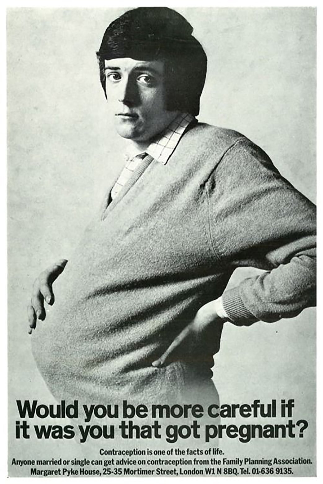 Η παραπάνω πρωτοποριακή αφίσα, σχεδιασμένη από τον Κράμερ Σάατσι για το Συμβούλιο Εκπαίδευσης Υγείας το 1970, ανάγκασε τον κόσμο να σκεφτεί τα φύλα και τους έμφυλους ρόλους και ενθάρρυνε τους άνδρες να αναλάβουν ευθύνη για την αντισύλληψη