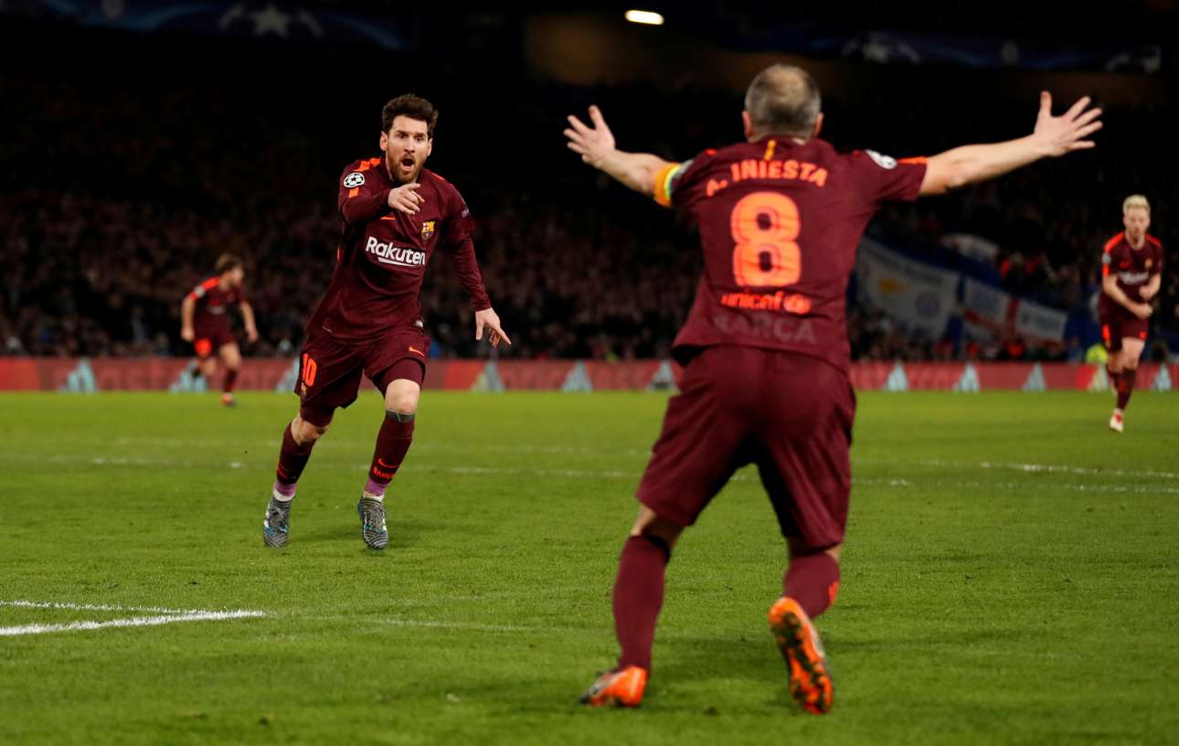 Τρίτη, 20 Φεβρουαρίου, Λονδίνο. Ο Μέσι της Μπαρτσελόνα σκοράρει πετυχαίνοντας το 1- 1 απέναντι στην Τσέλσι. Ο αργεντινός σούπερ σταρ πανηγυρίζει δείχνοντας τον Αντρές Ινιέστα που του έχει χαρίσει την ασίστ