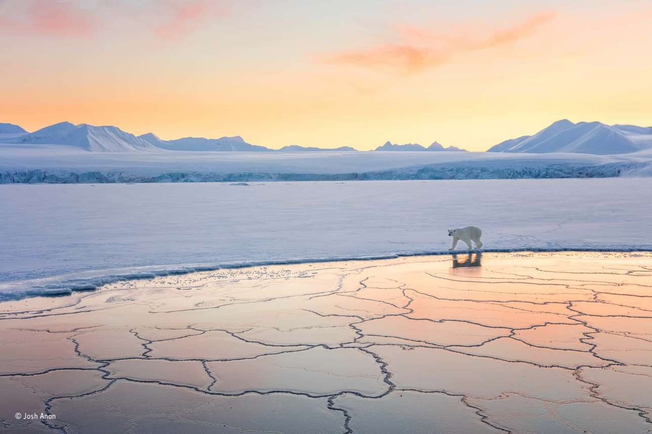 «Η Αρκτική είναι πανέμορφη όλον τον χρόνο, αλλά στα τέλη του χειμώνα όταν η θερμοκρασία φτάνει στους -30 βαθμούς Κελσίου, όλα είναι λευκά και ο ήλιος βρίσκεται χαμηλά στον ορίζοντα, γίνεται μαγευτική. Ο φωτογράφος ήταν πάνω σε βάρκα σε ένα φιόρδ απέναντι από το Σβάλμπαρντ της Νορβηγίας όταν συνάντησε την πολική αρκούδα να περπατάει στην άκρη του πάγου με τη λευκή γούνα της να λούζεται στο φως του δειλινού