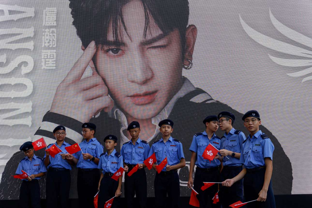Ενστολοι έφηβοι του Χονγκ Κονγκ στέκονται κάτω από τεράστιο ηλεκτρονικό πορτρέτο ντόπιου ποπ ειδώλου – την 1η Ιουλίου συμπληρώθηκαν 27 έτη από την ένταξη της πρώην βρετανικής αποικίας στον εθνικό κορμό
