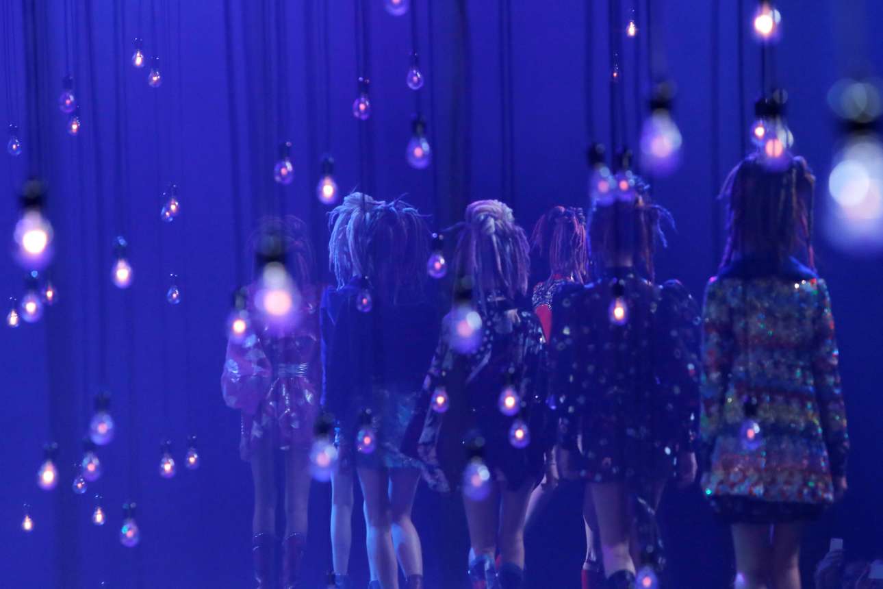 Νέα Υόρκη, ΗΠΑ, 15 Σεπτεμβρίου. Πανκ μοντέλα, με τζίβες, ψηλά πόδια και έντονα χρώματα, στην πασαρέλα της Νέας Υόρκης για την παρουσίαση της ανοιξιάτικης συλλογής του Marc Jacobs, στην εβδομάδα μόδας