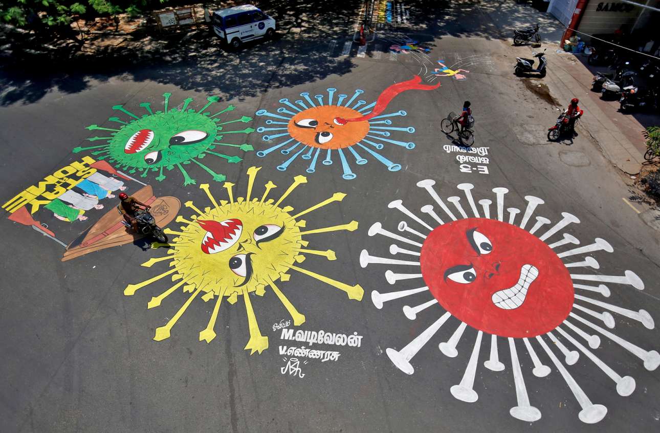 Ινδικές ζωγραφιές στην άσφαλτο «βλέπουν» τον ουρανό και προειδοποιούν για την αγριότητα του κορονοϊού. Είναι σαν να λένε οι Ινδοί στους χιλιάδες θεούς τους: «Τι μας στείλατε!»