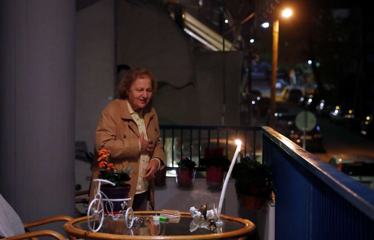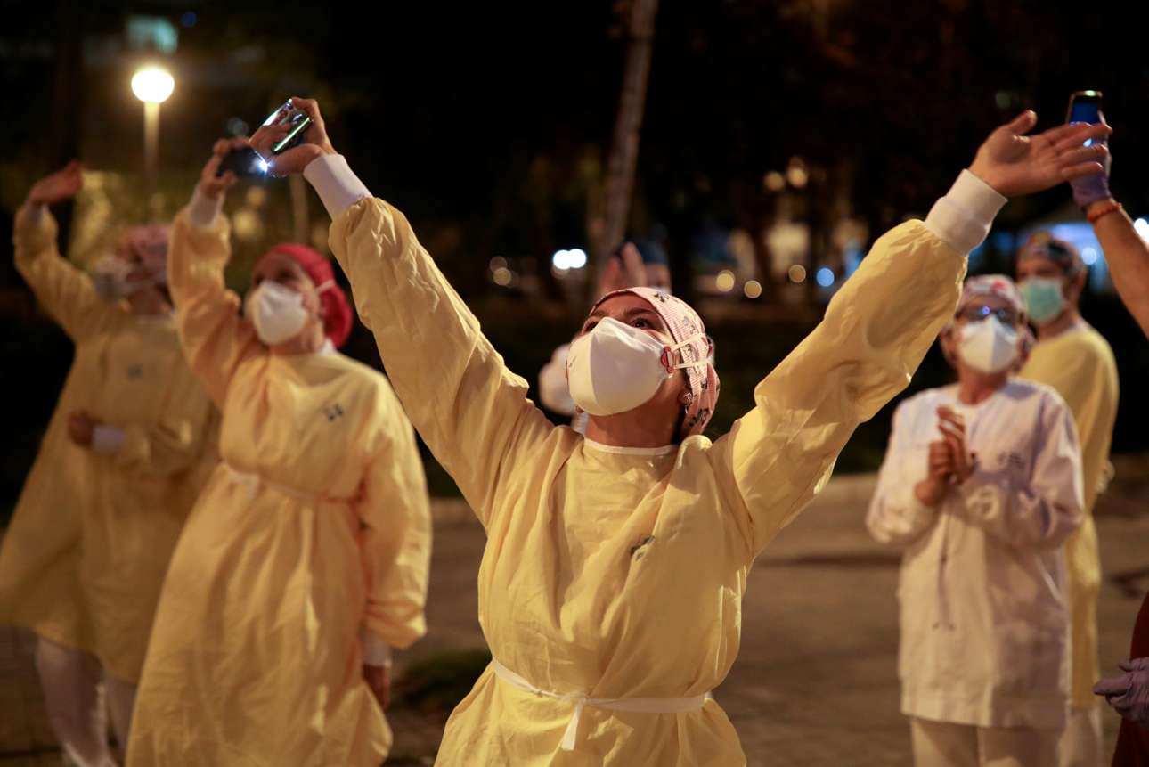 Οι υγειονομικοί ανταποδίδουν τις επευφημίες και τις ευχές των πολιτών που βρίσκονται στα μπαλκόνια των διαμερισμάτων τους, στη Βαρκελώνη