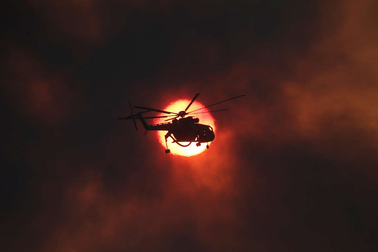 Τρίτη, 15 Αυγούστου. Ενα ελικόπτερο κατάσβεσης περνά μπροστά από τον ήλιο πάνω από το Καπανδρίτι. Οι πυκνοί καπνοί από την καταστροφική φωτιά υψώνονται στον ουρανό