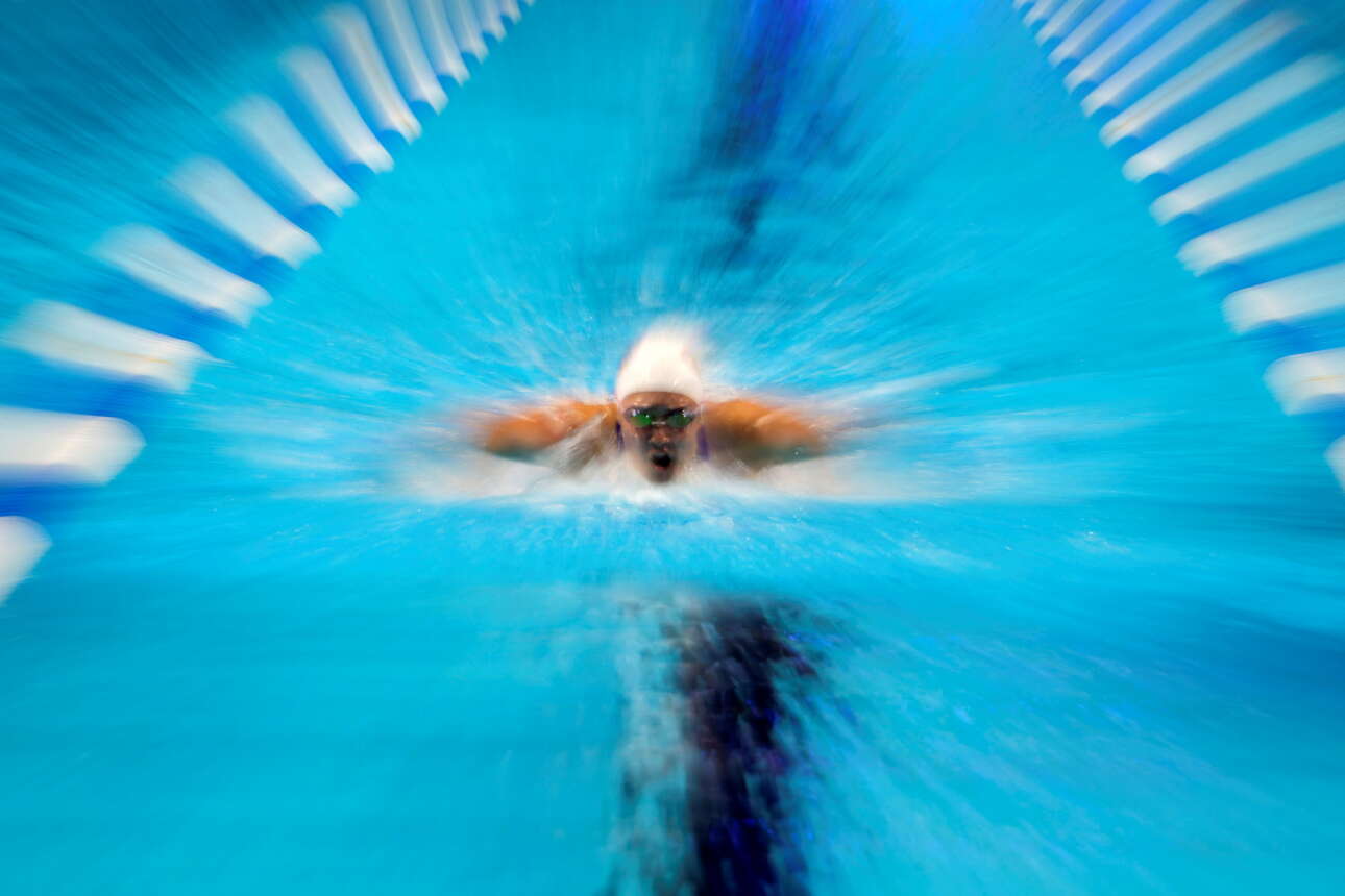 Η κολυμβήτρια Αλις Πιτσιρίλο επιδίδεται στην «πεταλούδα» στην Ομαχα - καρέ από το προολυμπιακό τουρνουά της ομάδας των ΗΠΑ