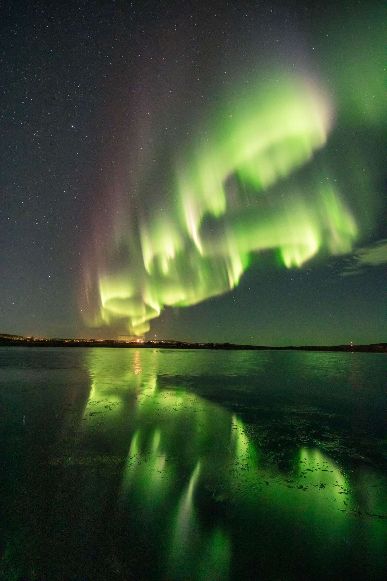 Το Βόρειο Σέλας σχηματίζει αυτά τα φωτεινά σχήματα στον ουρανό της φινλανδικής πόλης Ροβανιέμι, τα οποία καθρεφτίζονται και στην επιφάνεια που μοιάζει με νερό. (Καθότι νωρίς είναι για πάγους – ή μήπως όχι;)
