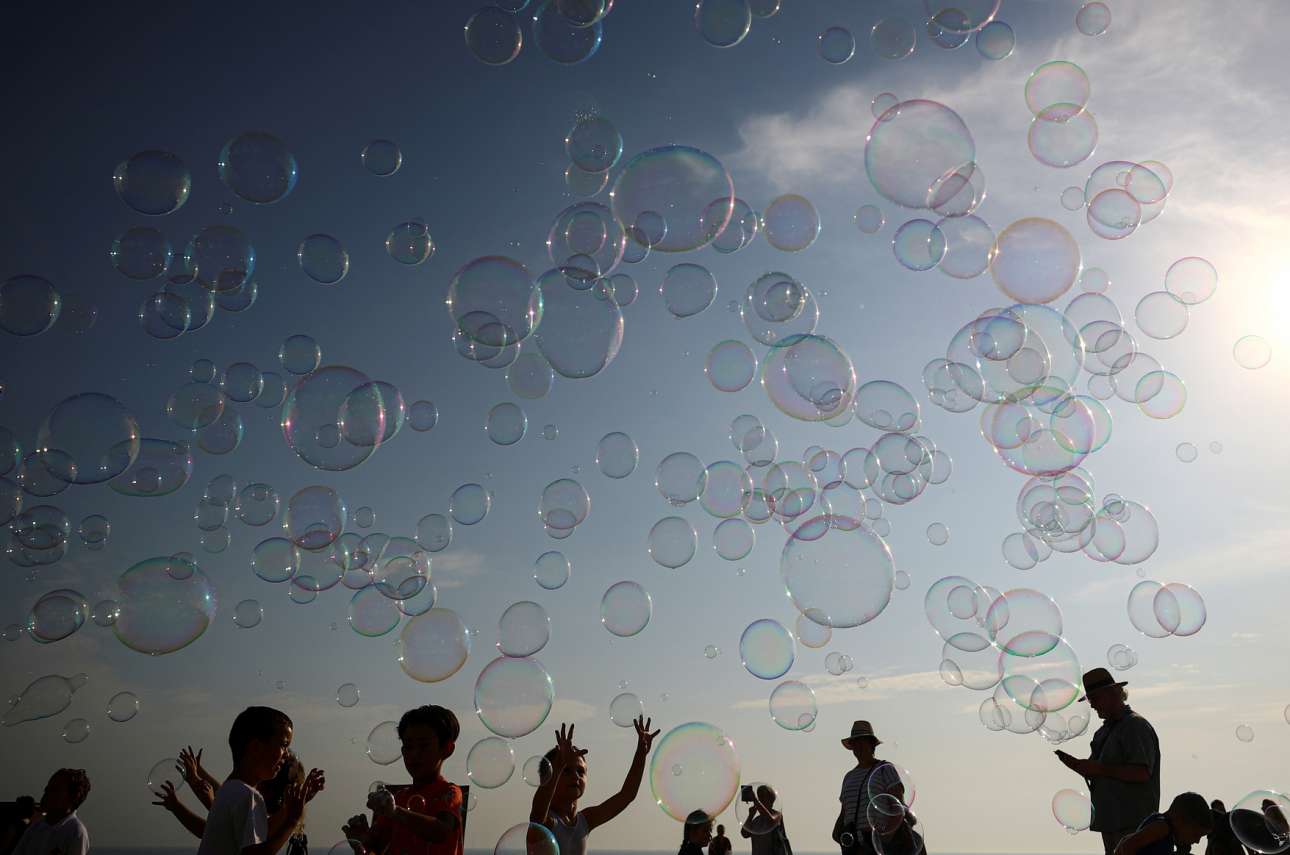 Παιδιά και σαπουνόφουσκες, αλλά και μερικοί μεγάλοι, μαζί τους και η φωτογράφος, συνυπάρχουν στην παραλία του Μπράιτον, ελέω αιθρίας. Αγγλία (και ας μη φαίνεται τίποτε από δαύτη στο καρέ)