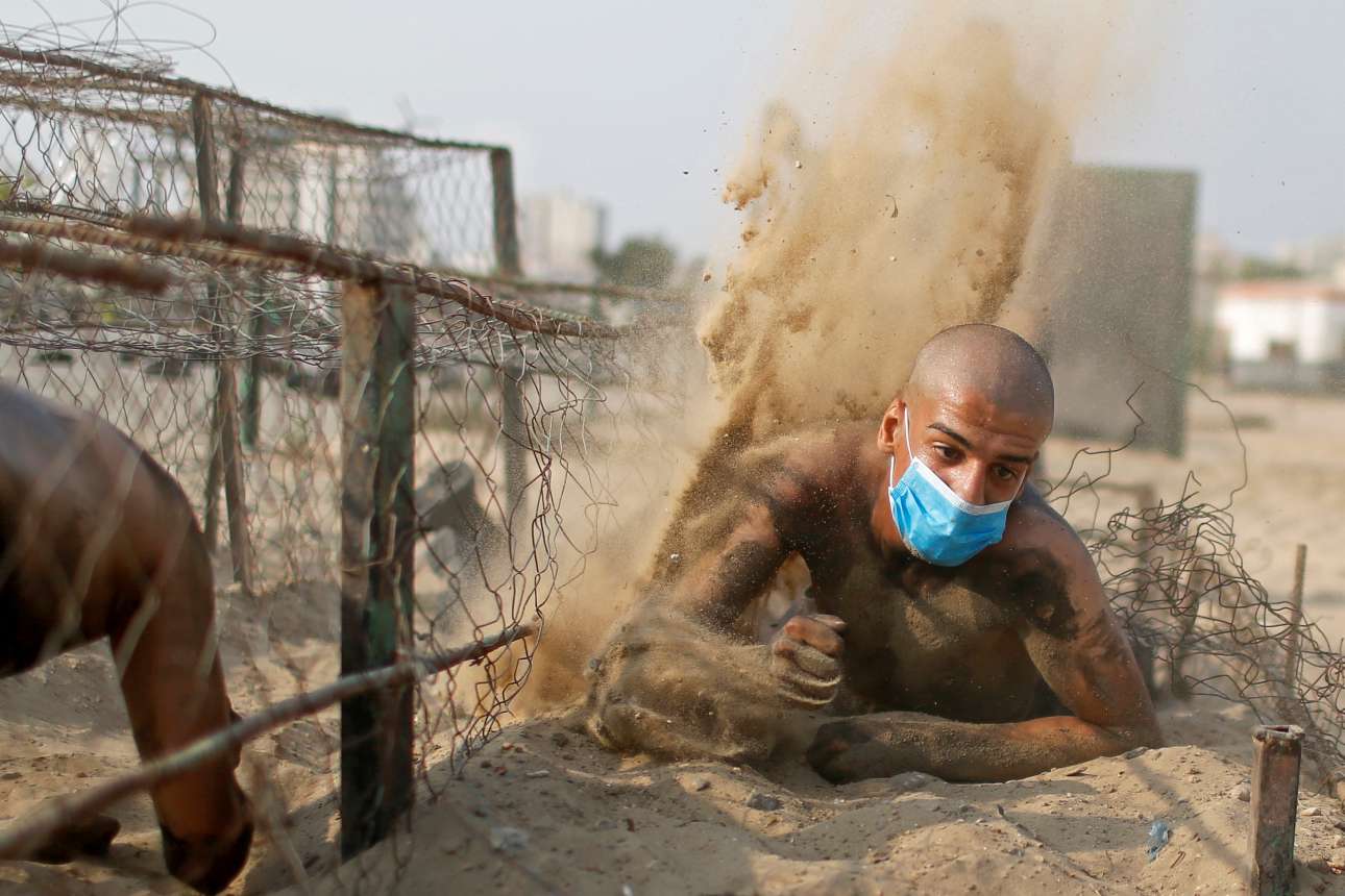 Νεαρός Παλαιστίνιος εκτελεί άσκηση πεδίου του Πεζικού, η οποία μάλλον δεν έχει και μεγάλη σχέση με τον λόγο της εκπαίδευσής του: θα ενισχύσει, λέει η λεζάντα του πρακτορείου, την αστυνομία της Γάζας στην καταπολέμηση της εξάπλωσης του κορονοϊού