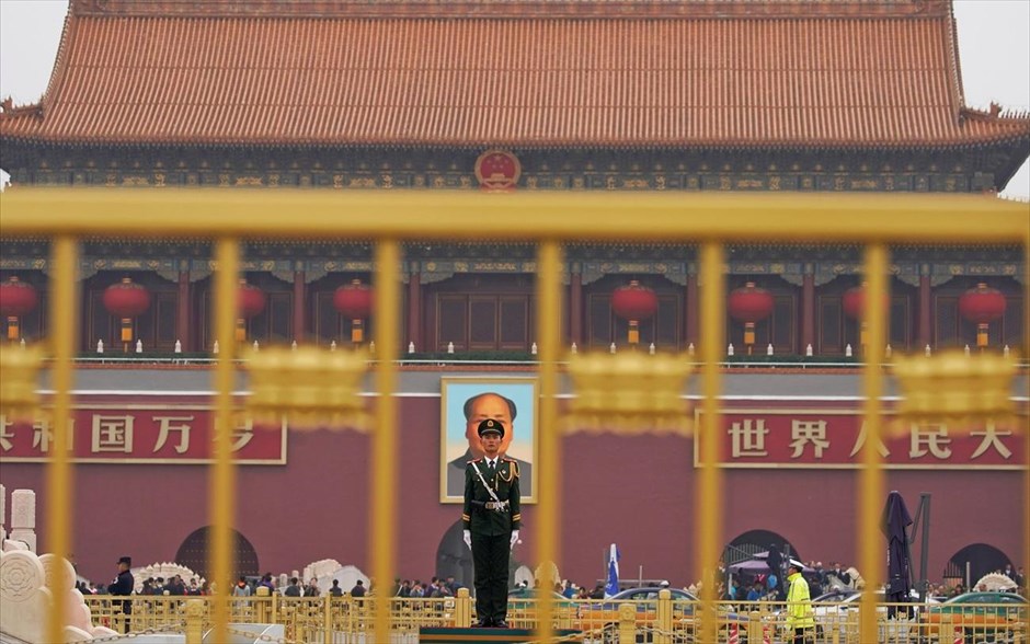 Τρίτη, 17 Οκτωβρίου, Πεκίνο. Φρουρός διακρίνεται μπροστά από το γιγαντιαίο πορτρέτο του ιδρυτή της Λαϊκής Δημοκρατίας της Κίνας, Μάο Τσε Τουνγκ που έχει στηθεί στην πύλη της Τιεν Αν Μεν, μία μέρα πριν από την έναρξη των εργασιών του 19ου Εθνικού Συνεδρίου του Κομμουνιστικού Κόμματος της Κίνας.