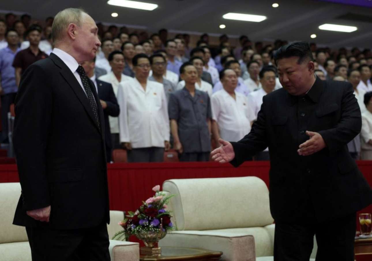 Φιλόφρων ο Κιμ Γιόνγκ-ουν (δεξιά), «κλαρίνα» οι εκπρόσωποι του λαού (στο φόντο) και ο Βλαντίμιρ Πούτιν ανέκφραστος μεν, με σφιγμένες τις γροθιές δε – στιγμιότυπο από την επίσκεψη του ρώσου προέδρου στη Βόρεια Κορέα