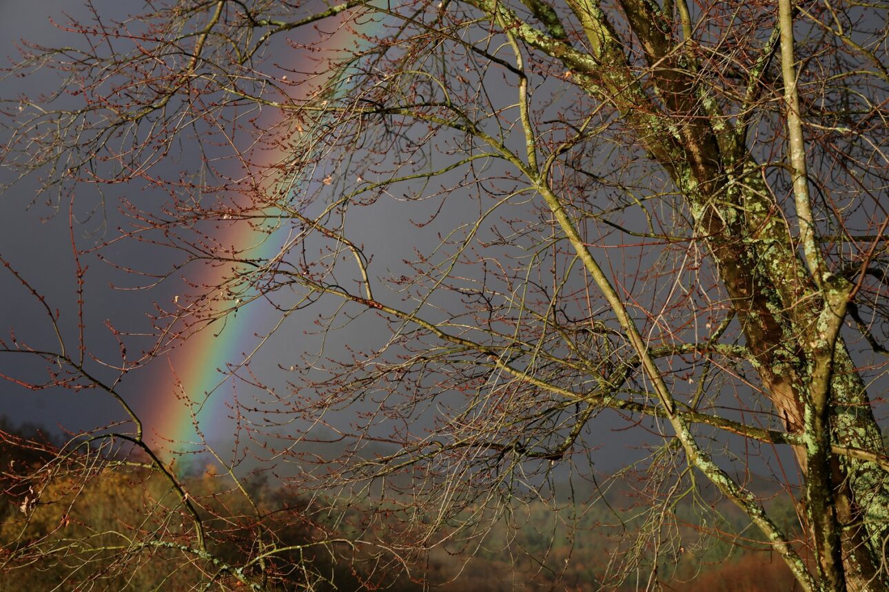 Μετά τη φθινοπωρινή βροχόπτωση ουράνιο τόξο στεφάνωσε την ύπαιθρο της Βόννης με τον βαρύ, μολυβένιο ουρανό