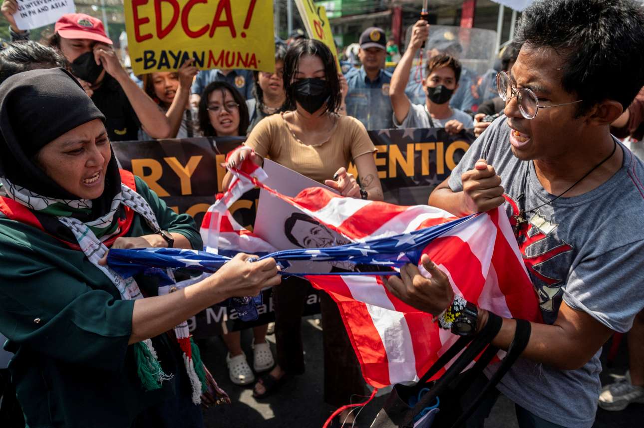 Φιλιππινέζοι διαδηλωτές, μια μουσουλμάνα και ένας χριστιανός, ξέσκισαν με μανία την αστερόεσσα λόγω Παλαιστινιακού – το στιγμιότυπο είναι από πορεία διαμαρτυρίας για την επίσκεψη του υπουργού Εξωτερικών των ΗΠΑ, Αντονι Μπλίνκεν, στη Μανίλα