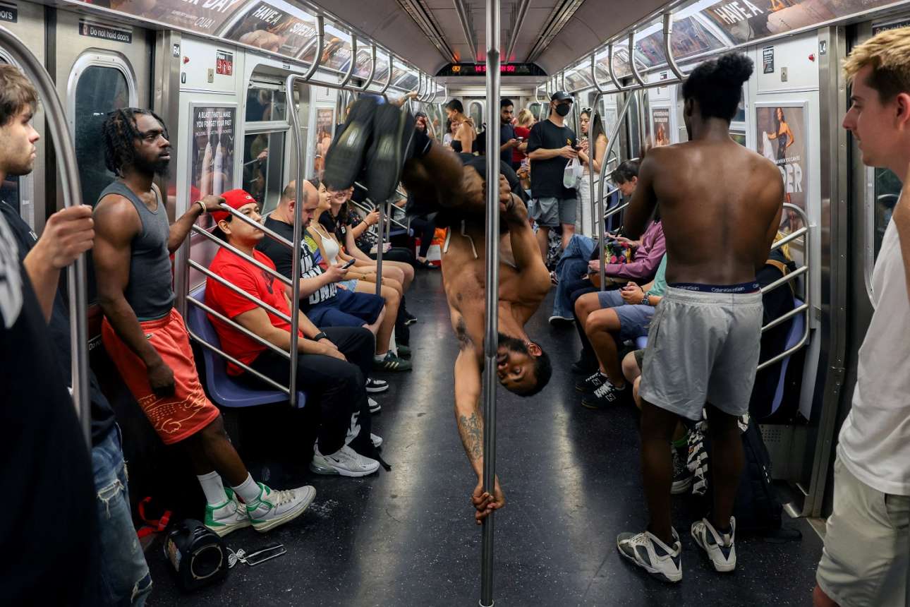 Ακροβατικό μαντράχαλου σε κινούμενο βαγόνι του νεοϋορκέζικου μετρό, ιδανικό για ξεπατικωτούρα από τη μιμητική πιτσιρικαρία της Αθήνας