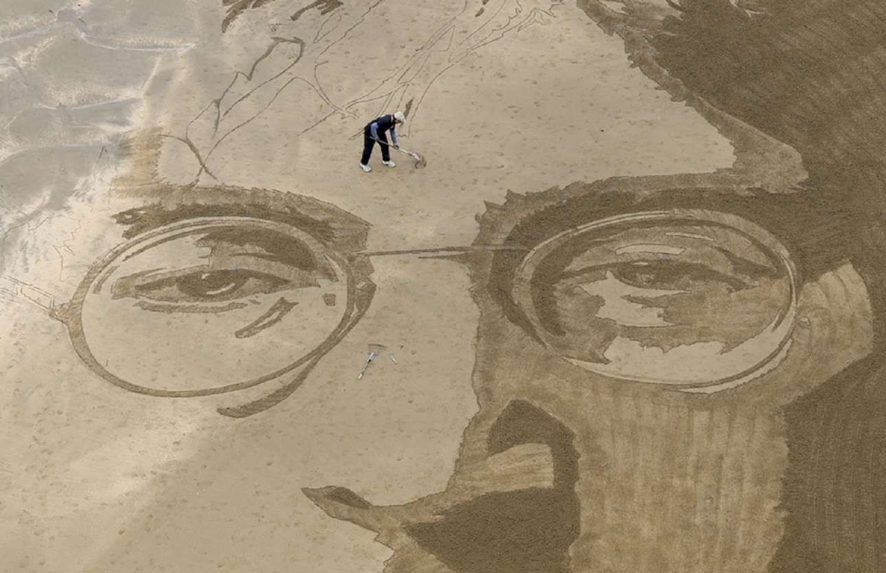 Πορτρέτο αμμουδιάς για viral μεγαλεία, αφού ο καλλιτέχνης (διακρίνεται στο κούτελο του «Τζον Λένον») ξέρει ότι το κύμα είναι αδηφάγο