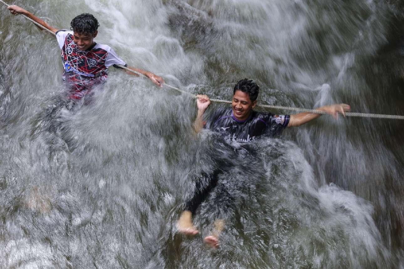 Αυτοί οι νεαροί Μαλαισιανοί βούτηξαν σε ορμητικό ποτάμι και δροσίστηκαν, αφού πρώτα προνόησαν να κρατηθούν γερά από το σχοινί