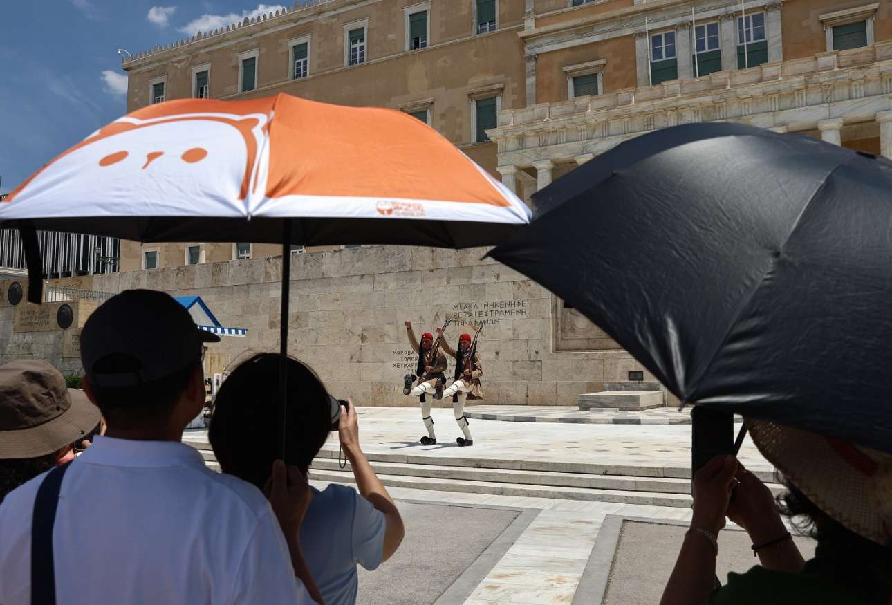 Τουρίστες στον Αγνωστο Στρατιώτη ντάλα μεσημέρι, την ώρα που άλλαζε η φρουρά και το λιοπύρι έκαιγε τα τσιμέντα και την άσφαλτο