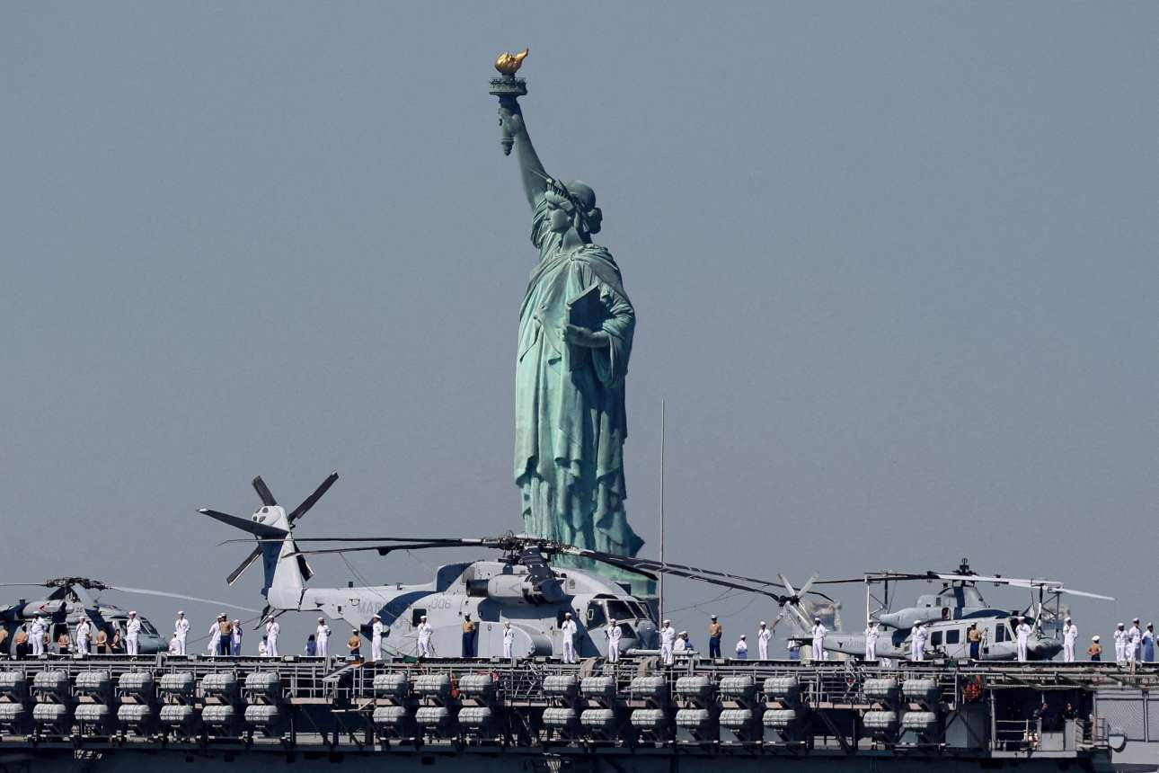 Παρατεταγμένοι στο «άπερντεκ» πολεμικού πλοίου και δίπλα στη δάδα του Αγάλματος της Ελευθερίας, ναύτες και πεζοναύτες των ΗΠΑ κατέπλευσαν μεγαλοπρεπώς στον λιμένα της Νέας Υόρκης – οι αδειούχοι γλέντησαν την «Εβδομάδα Στόλου 2024» στα μπαρ