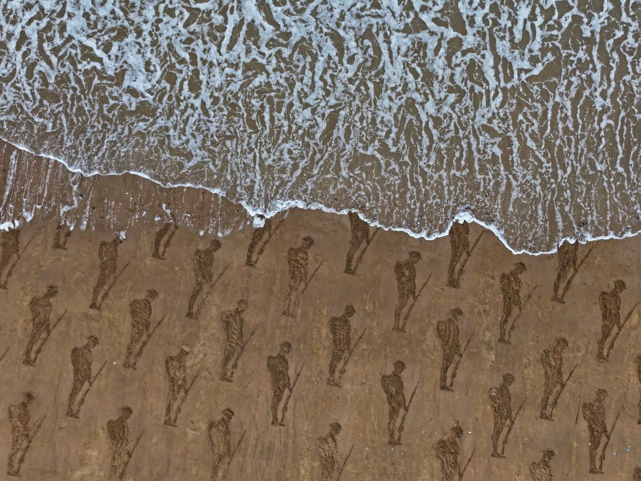 Εγκατάσταση σε αμμουδιά βρετανικής ακτής αναπαριστά πεζικάριους της λεγόμενης «D-Day» – το έργο φιλοτέχνησε φιλανθρωπική οργάνωση βετεράνων για να τιμήσει την 80ή επέτειο της απόβασης των Δυτικών συμμάχων στη Νορμανδία, στις 6 Ιουνίου 1944