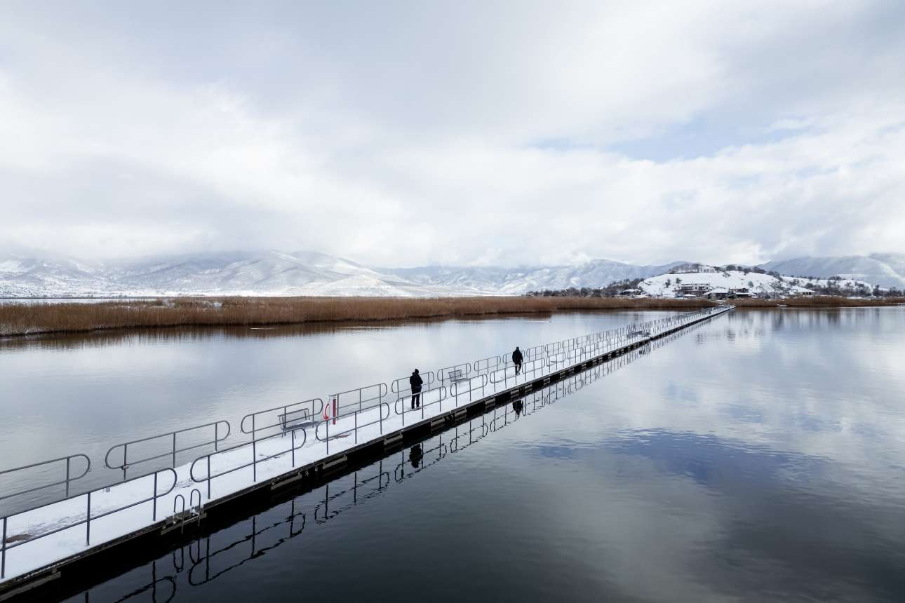 Κάθε χειμώνα είναι μαγευτική η Μικρή Πρέσπα της Φλώρινας: εδώ βλέπουμε χιονισμένη τη γέφυρα που οδηγεί στο νησάκι του Αγίου Αχιλλείου