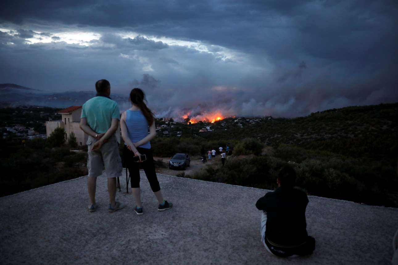 Δευτέρα, 23 Ιουλίου, Αθήνα. Κάτοικοι στην περιοχή της Ραφήνας παρακολουθούν την πορεία της πύρινης λαίλαπας. Η φωτιά σταμάτησε στη θάλασσα ολοκληρώνοντας μία από τις μεγαλύτερες τραγωδίες στην σύγχρονη ιστορία της χώρας και αφήνοντας πίσω της δεκάδες νεκρούς