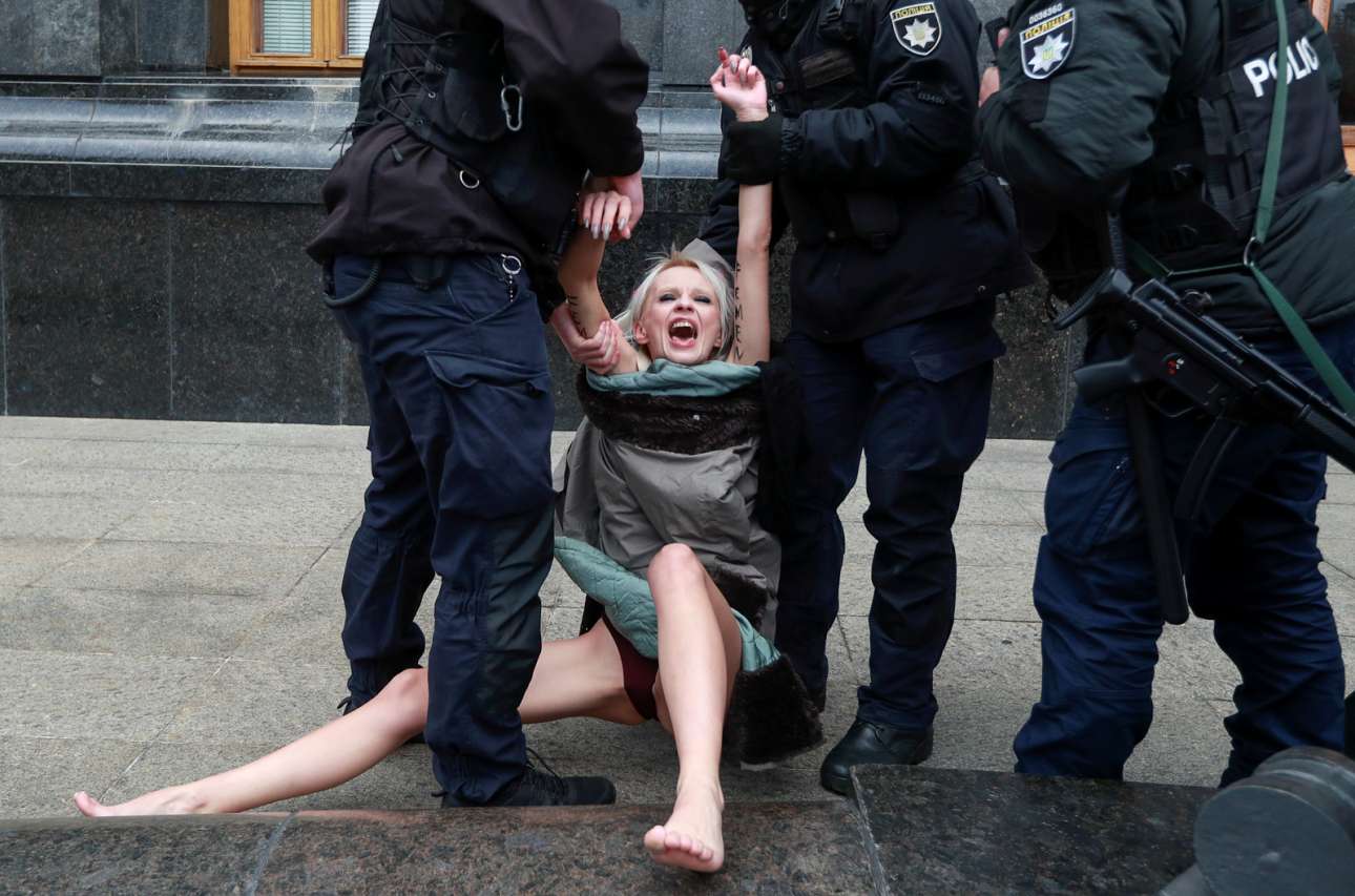 Femen, τουτέστιν ημίγυμνες διαδηλώτριες. Τι και αν στο Κίεβο είχε ξημερώσει η «Διεθνής Ημέρα Εξάλειψης της Βίας κατά των Γυναικών»; Οι χωροφύλακες, ντυμένοι μέχρι τα μπούνια, επενέβησαν