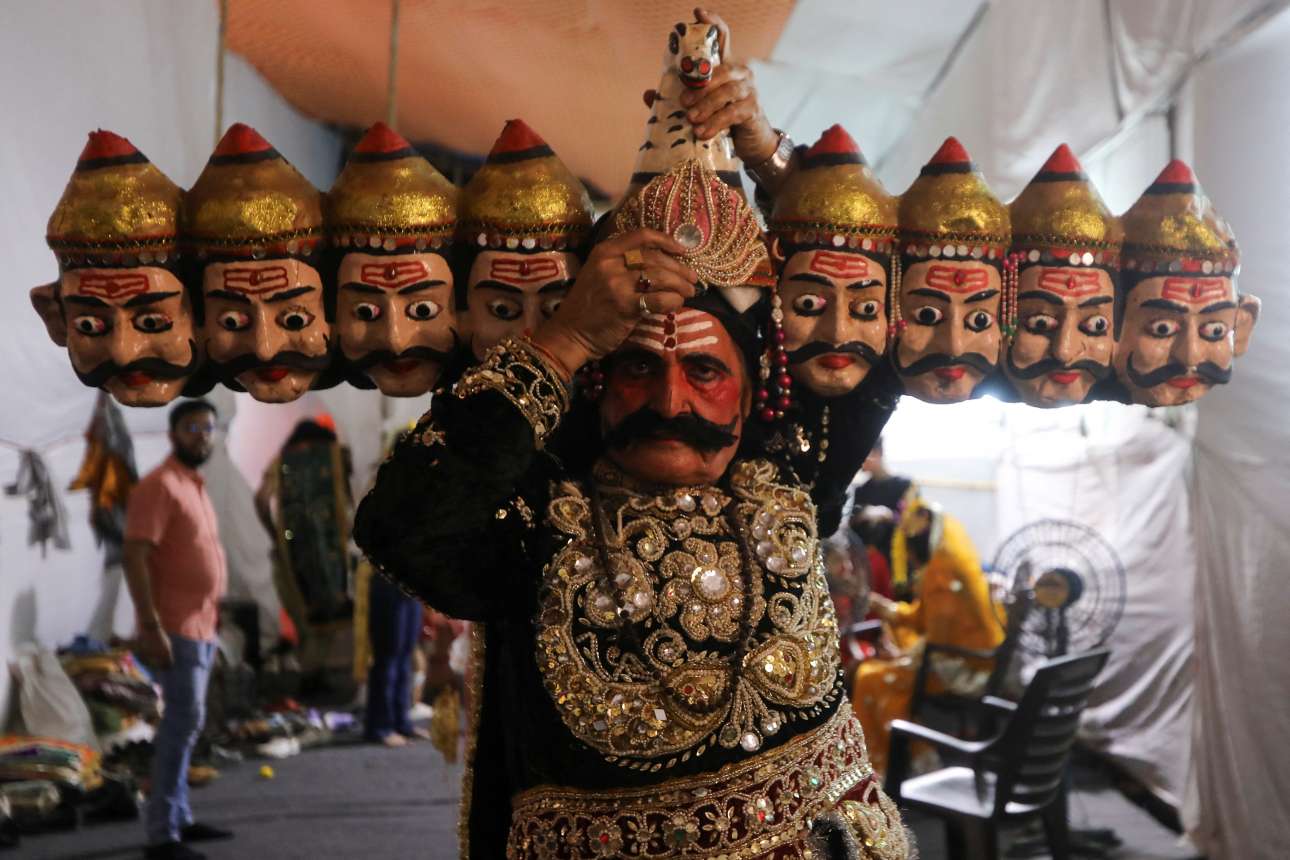 Καλλιτέχνης της Βομβάης, με χρυσοκέντητη στολή και εντυπωσιακό μακιγιάζ, λίγο προτού βγει στη σκηνή φόρεσε το βαρύ καπέλο με τα οκτώ κεφάλια του βασιλιά Ραβάνα, ενός παλιοχαρακτήρα αλλά και λογίου της ινδικής μυθολογίας – πανάξιο μεροκάματο