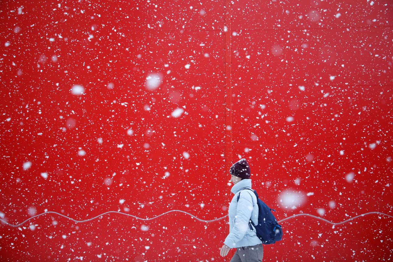 Μία Ρωσίδα διαβαίνει τον δρόμο μέσα σε πυκνή χιονόπτωση, με τις νιφάδες να σπάνε τη μονοτονία του κόκκινου τοίχου – στη Σταυρούπολη, άλλοτε σπουδαίο κέντρο του ποντιακού Ελληνισμού