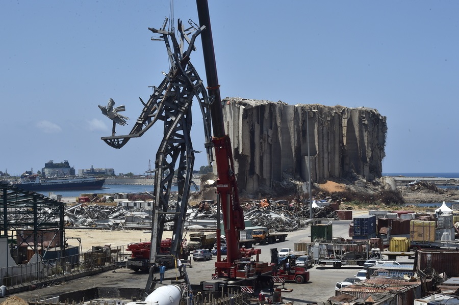 Ο γερανός στήνει στο λιμάνι της Βηρυτού ένα σιδερένιο μνημείο εις μνήμην των θυμάτων της τρομερής έκρηξης που έγινε εκεί στις 4 Αυγούστου πέρσι