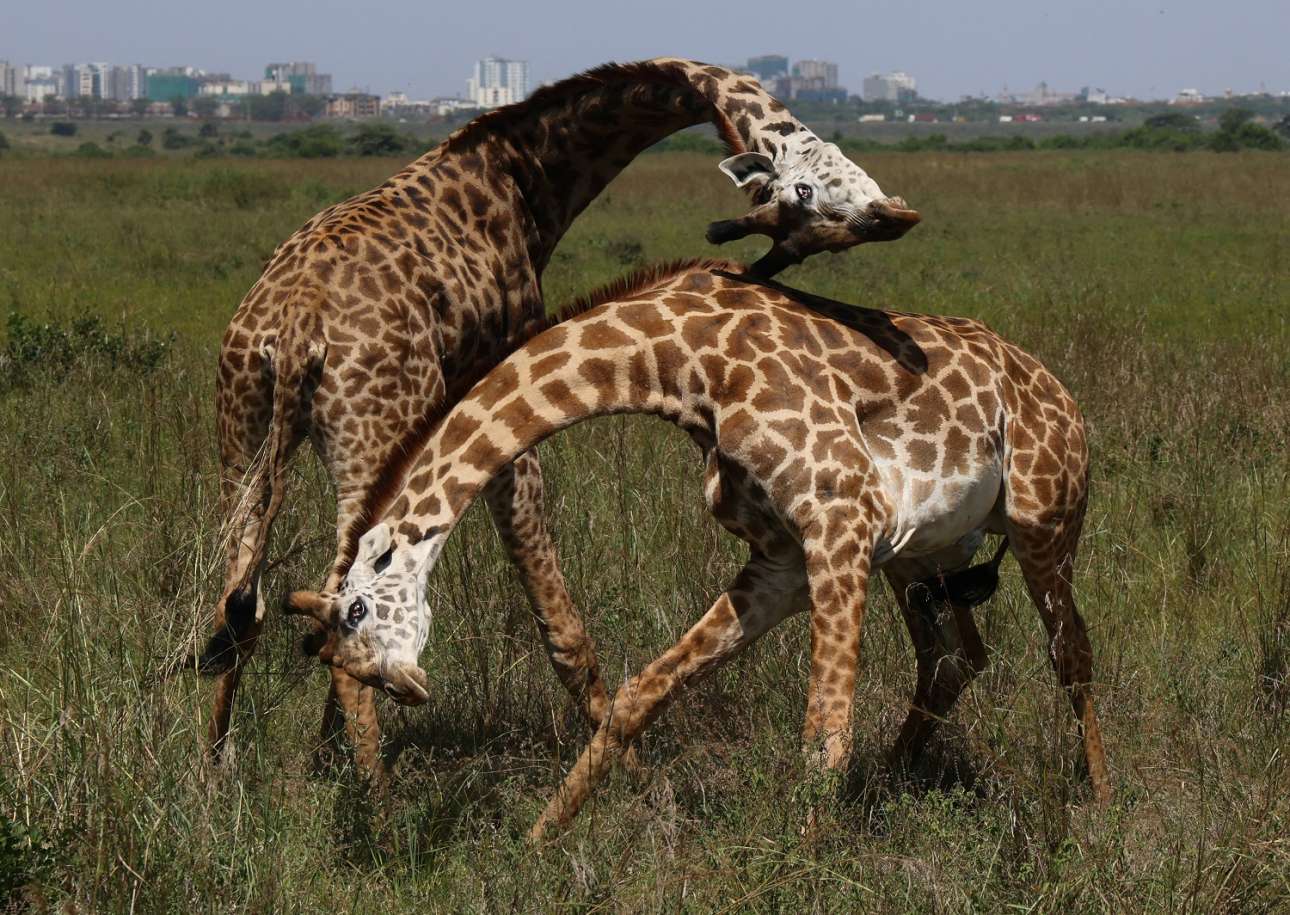 Νάζι, σκέρτσο και πόζα από δύο κενυάτισσες καμηλοπαρδάλεις, με φόντο πολυκατοικίες του Ναϊρόμπι – μπορεί, όμως, απλώς να έπαιζαν μεταξύ τους και να κορόιδεψαν τον αδιάκριτο φακό