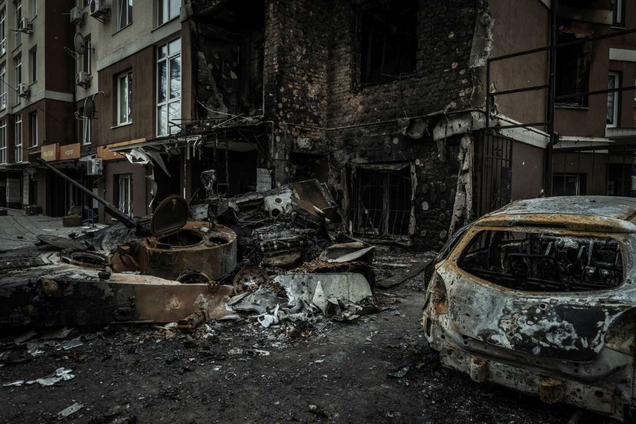 Φωτογραφία εξίσου τρομαχτική με την προηγούμενη, αν και δεν δείχνει ανθρώπους ή ζώα, τραβηγμένη από τον ίδιο φωτογράφο κιόλας: εικονίζονται ένα κατεστραμμένο ρωσικό τεθωρακισμένο, ένα καμένο Ι.Χ. και τα χαλάσματα μίας πολυκατοικίας μέσα στον αστικό ιστό του Ιπρίν