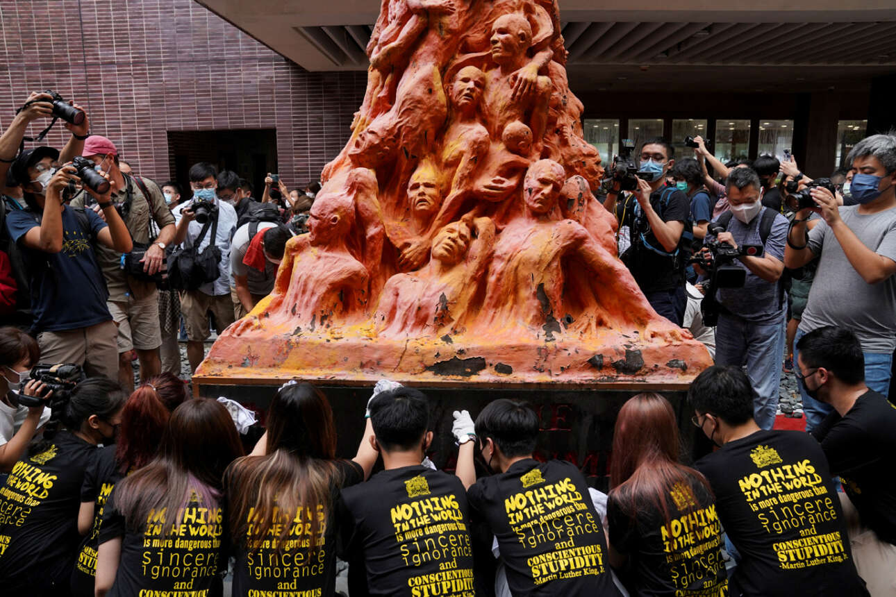 Για να πικάρουν τον Σι Τζινπίνγκ, δυτικόφιλοι φοιτητές του Χονγκ Κονγκ φωτογραφίζονται μπροστά σε ένα το άγαλμα που το λένε «Στήλη της ντροπής» με αφορμή την 32η επέτειο των αιματηρών γεγονότων της πλατείας Τιενανμέν