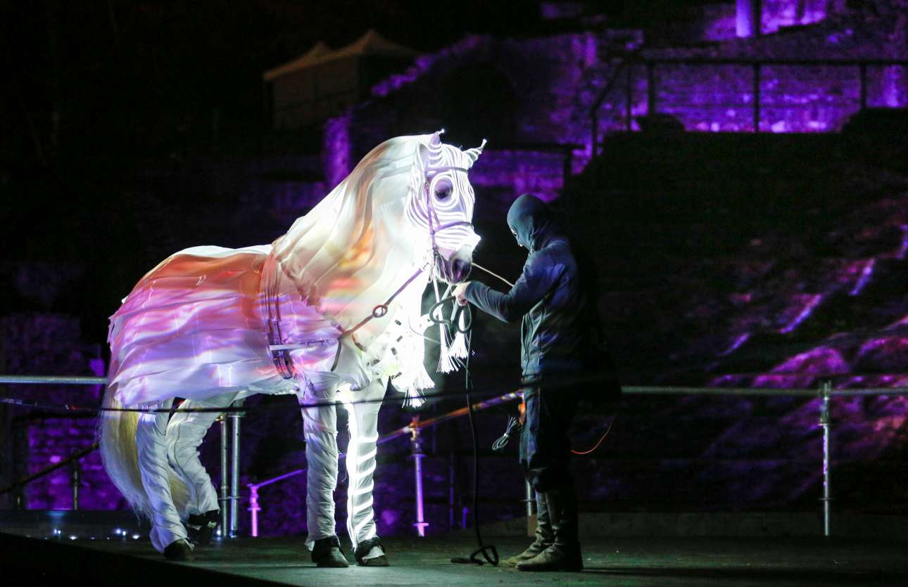 Πέμπτη, 7 Δεκεμβρίου, Γαλλία. Εκπαιδευτής προσαρμόζει μία ειδική στολή με φώτα LED σε ένα άλογο. Ολα αυτά είναι μέρος της εγκατάστασης «Balaha», του καλιτέχνη Damien Fontaine, κατά τη διάρκεια της πρόβας για το Φεστιβάλ Φωτός στη Λυών