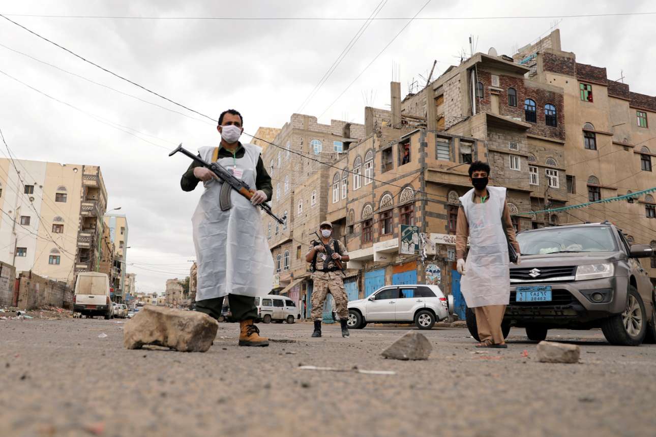 Στην Υεμένη οι άνδρες ασφαλείας φορούν και αυτοί προστατευτικές μάσκες, αφού ο κορονοϊός είναι απειλή αδιόρατη, εχθρός φονικός, και ας μην οπλοφορεί σαν άνθρωπος