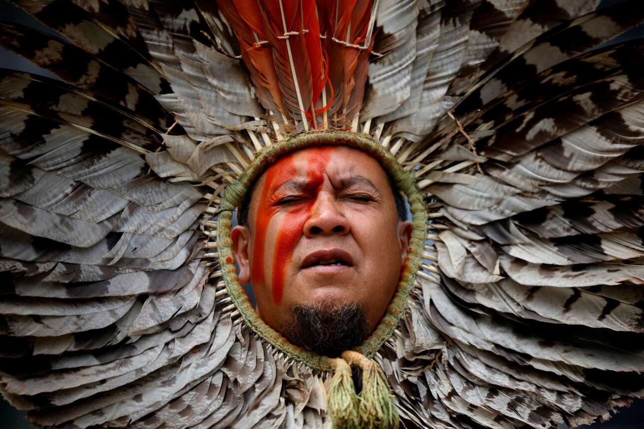 Ιθαγενής του Αμαζονίου τραγουδάει με κλειστά τα μάτια και αναπεπταμένα τα φτερά της στολής του έξω από το δικαστικό μέγαρο της γαλλικής πρωτεύουσας – οι βραζιλιάνοι ακτιβιστές πήγαν στο Παρίσι για να υποστηρίξουν αγωγή τους κατά γαλλικής εταιρείας που εμπλέκεται στην αποψίλωση του τροπικού δάσους