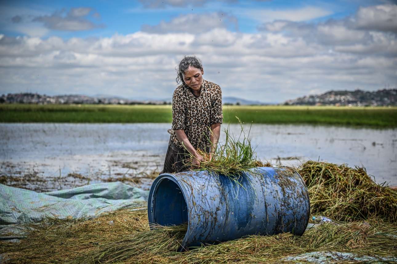Βοά ο κάματος της αγρότισσας στον ορυζώνα της Μαδαγασκάρης, διότι θέρισε με δρεπάνι τα φυτά και κουβάλησε μόνη της τα δεμάτια