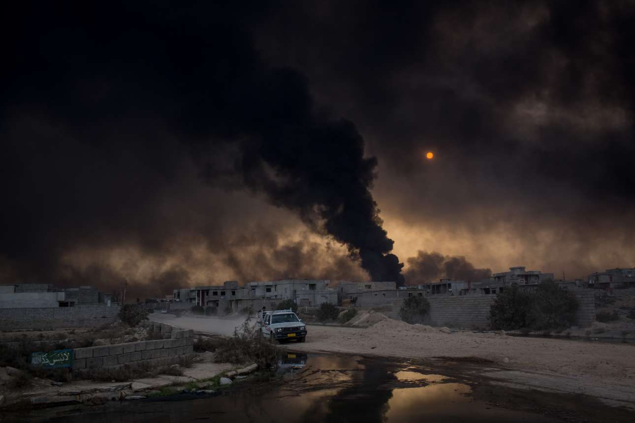 11 Νοε. Μία κατάμαυρη εικόνα στο Αλ Καγιάρα, λίγο έξω από τη Μοσούλη: μαυρισμένος ουρανός από τους καπνούς και μία μαύρη λίμνη, σαν πίσσα, από τη διαρροή πετρελαίου. Ακόμη κι έτσι ο ήλιος «τρυπά» το σύννεφο καπνού και φωτίζει το πετρέλαιο