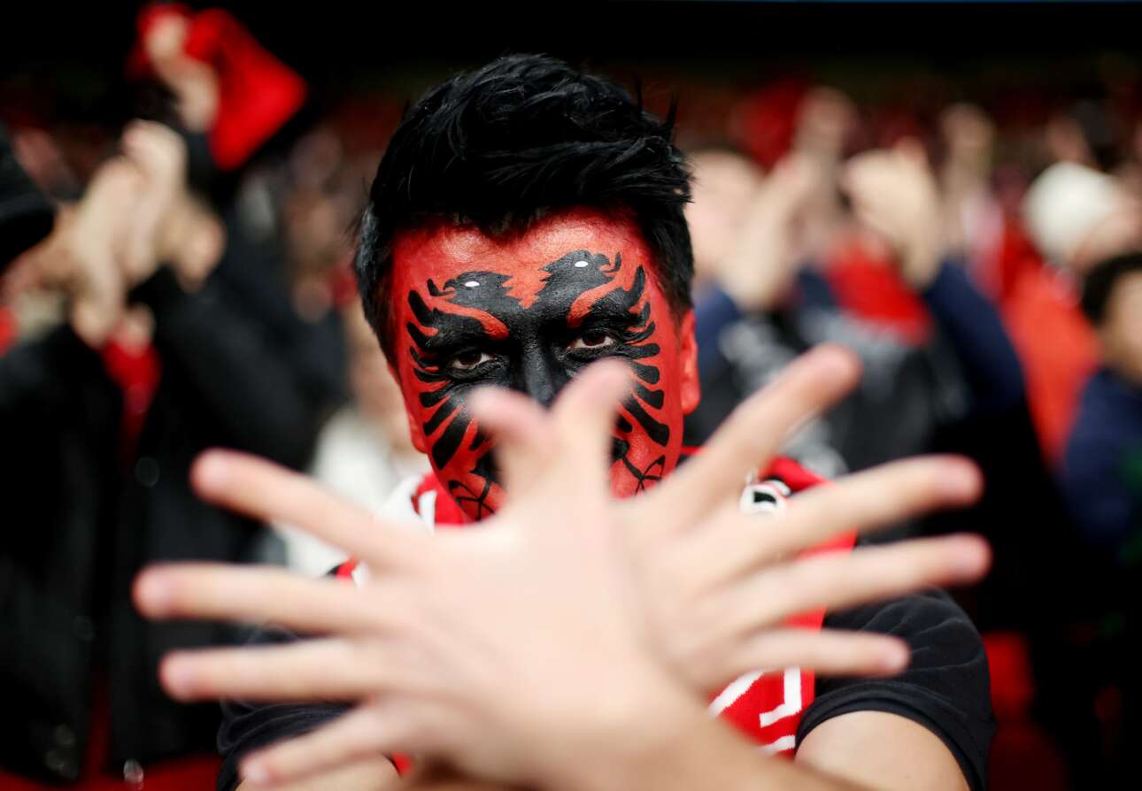 Αλβανός φίλαθλος απονέμει στον εαυτό του και μάλιστα εις διπλούν το παράσημο της ανοικτής παλάμης. Εντάξει, υπερέβαλε. Του έφτανε και μόνο μία μούντζα, αφού πάει γάντι με την πεντάρα που έφαγε η ομάδα του από την Εθνική Αγγλίας. Φασκελοκουκούλωστα...