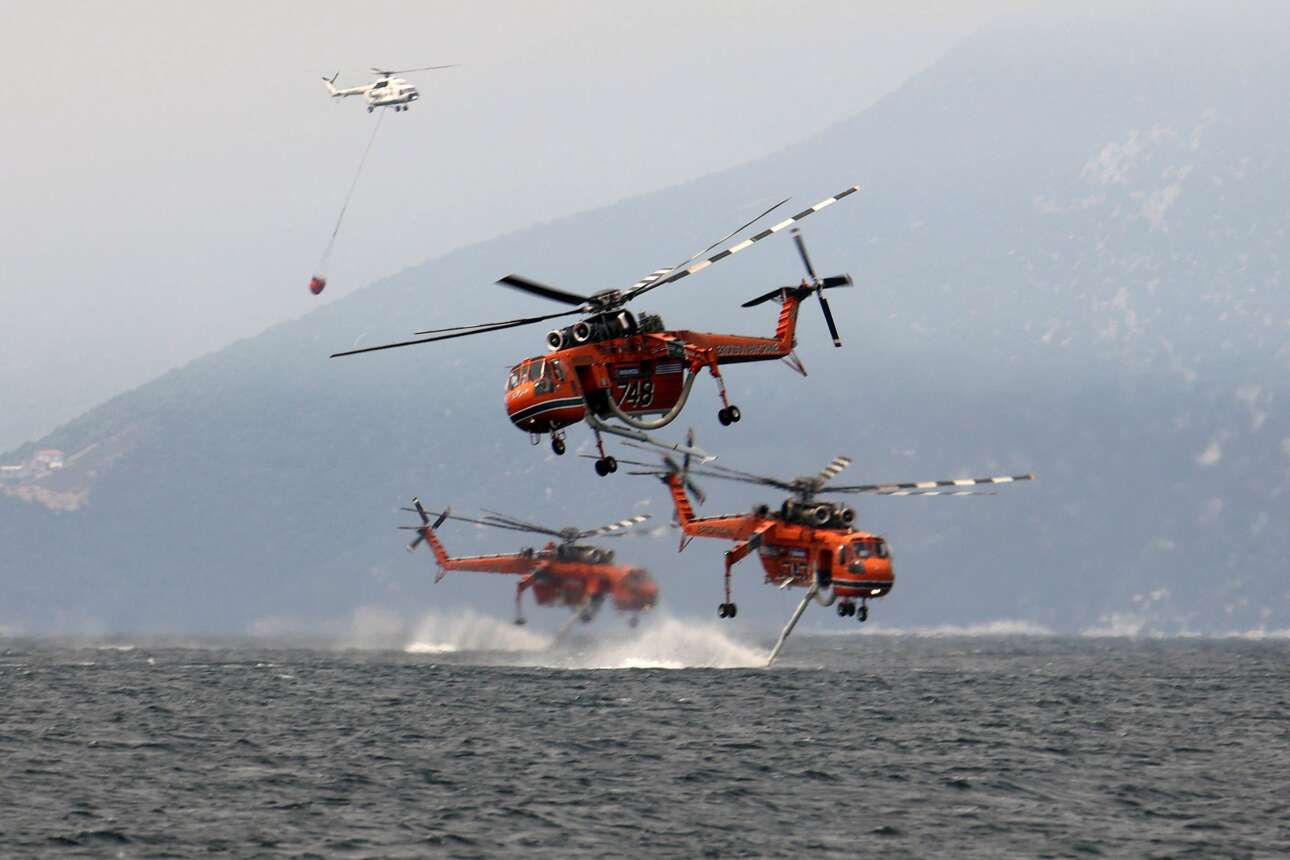 «Χορευτικό» καρέ της 10ης Αυγούστου, με τέσσερα πυροσβεστικά ελικόπτερα να σπεύδουν προς ανεφοδιασμό με νερό στο Πευκί της Εύβοιας. Εκείνη ήταν η όγδοη ημέρα της πυρκαγιάς που έκανε κάρβουνο τη μισή Εύβοια