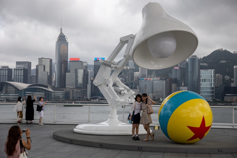 Μουντός ο ορίζοντας στο Χονγκ Κονγκ, αλλά τα κορίτσια βγάζουν φωτογραφίες δίπλα σε ένα γλυπτό σχήματος λαμπατέρ τεραστίων διαστάσεων, κατάλληλο για γίγαντες αναγνώστες (μελετούν τη σκέψη του Σι Τζινπίνγκ – αυτήν συμβολίζει η σφαίρα με το κόκκινο αστέρι)