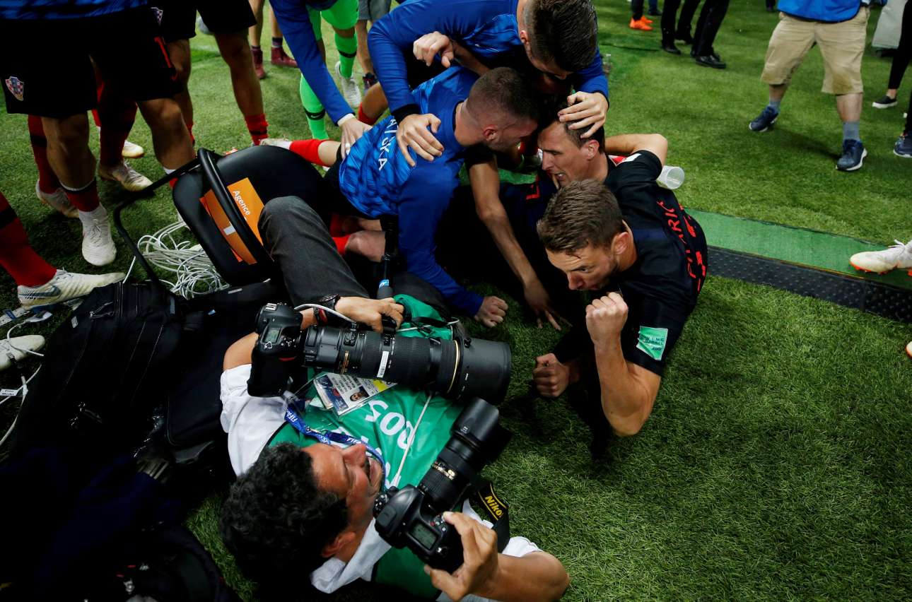 Όλα για τη φωτογραφία! Ο Γιούρι Κορτές, φωτογράφος του AFP (στο έδαφος με το πράσινο γιλέκο), βρέθηκε κάτω από τους παίκτες της Κροατίας ενώ πανηγύριζαν τη πρόκριση στον τελικό και πέτυχε το κλικ της καριέρας του