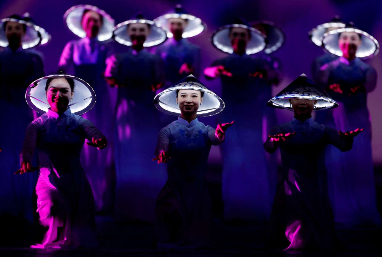 Τα καπέλα είναι βιετναμέζικα, παραδοσιακά, αλλά με τον κατάλληλο φωτισμό έγιναν αμπαζούρ για της ανάγκες της τελετής έναρξης των Αγώνων Νοτιανατολικής Ασίας, αθλητικής φύσεως – οι χορεύτριες είναι άνθρωποι, όχι ολογράμματα, και το καρέ από το Ανόι