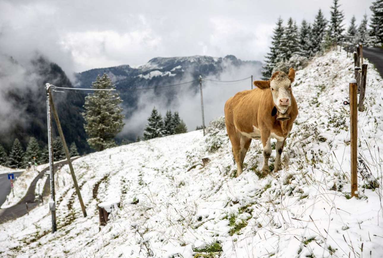 Την πρώτη χιονισμένη βόλτα τής σεζόν έκανε η αγελάδα με την κουδούνα – το ελβετικό καιρικό κυπρί σήμανε κιόλας χειμωνιάτικα μηνύματα στις βουκολικές Αλπεις