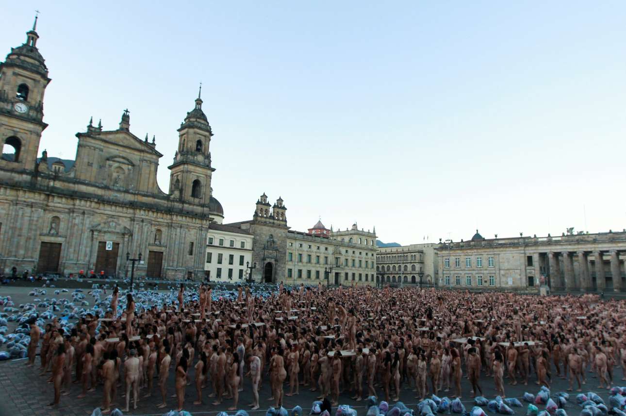 Επιλέγει τοποθεσίες με κοινωνικό στίγμα, πολιτικό υπόβαθρο ή ιδιαίτερη ομορφιά. Καλεί εκατοντάδες εθελοντές να ποζάρουν για τις φωτογραφίες του. Τους ζητά να ξεντυθούν. Να στηθούν γυμνοί. Σε διαφορετικές συνθέσεις ή στάσεις κάθε φορά. Γιατί «μία μάζα ατόμων, γυμνών, στιβαγμένων ο ένας δίπλα στον άλλον, μεταμορφώνεται σε ένα νέο σχήμα», όπως έχει εξηγήσει ο ίδιος. Ο αμερικανός φωτογράφος, Σπένσερ Τιούνικ, από το 1992 κατευθύνει γυμνές μάζες και τις φωτογραφίζει, στις πιο ενδεικτικές αλλά και πιο αλλοπρόσαλλες τοποθεσίες. Σε παγετώνα στις Αλπεις, σε σκεπή κτιρίου στη Βαρκελώνη, έξω από την όπερα του Μονάχου, στο γήπεδο Ενρστ Χάπελ της Βιέννης, σε κεντρική πλατεία στο Μεξικό, στο Γκραντ Σέντραλ της Νέα Υόρκη, στο Selfridges του Λονδίνου. Ο 49χρονος καλλιτέχνης «χτύπησε» ξανά. Στη Μπογκοτά, στην κρύα Μπογκοτά του (χειμερινού) Ιουνίου. Για να γιορτάσει με τη μηχανή του την ειρήνη που θα φέρει η συμφωνία στην οποία βρίσκεται πολύ κοντά η κυβέρνηση της Κολομβίας με τις Επαναστατικές Ενοπλες Δυνάμεις Κολομβίας (FARC)