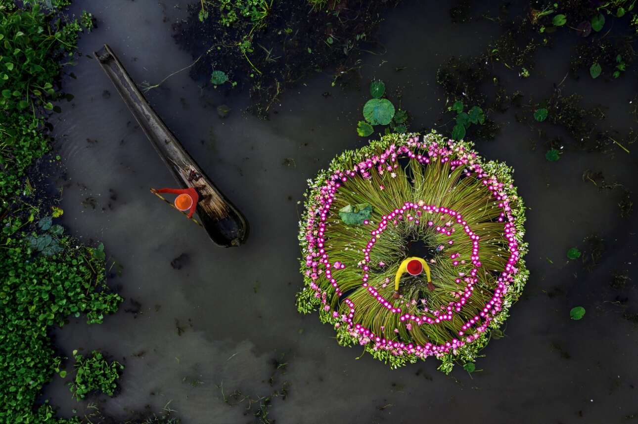 Επιλαχών στην κατηγορία Ανθρωποι. Αυτή η εικόνα τραβήχτηκε από drone για να δείξει τους κατοίκους της υπαίθρου εν ώρα εργασίας, κατά την περίοδο των μουσώνων, στους υγροτόπους της Δυτικής Βεγγάλης. Οι δύο εργάτες της εικόνας ξεχωρίζουν με τα πολύχρωμα καπέλα και τα ρούχα τους. Ο ένας από αυτούς φαίνεται σαν να αναδύεται μέσα από τα νούφαρα που δημιουργούν δύο ομόκεντρους χρωματιστούς δακτυλίους