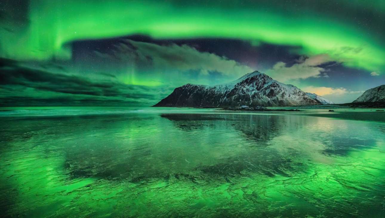 Η εικόνα του Αντρέας Ετλ δείχνει το Βόρειο Σέλας που αντανακλάται στην παραλία Skagsanden, στα νησιά Lofoten, στη Νορβηγία. Το σέλας φαίνεται να περικυκλώνει το Hustinden, το βουνό στο βάθος