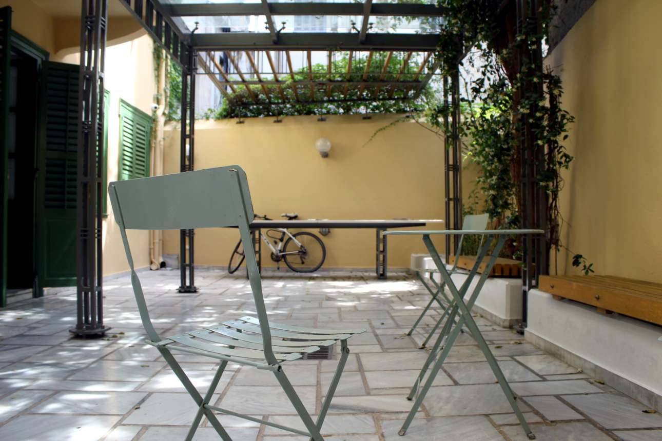 Το τριώροφο νεοκλασικό κτίριο του Πολιτιστικού Ιδρύματος Ομίλου Πειραιώς «κρύβει» μία ήσυχη, αστική αυλή στην πίσω πλευρά (Αγγέλου Γέροντα 6)