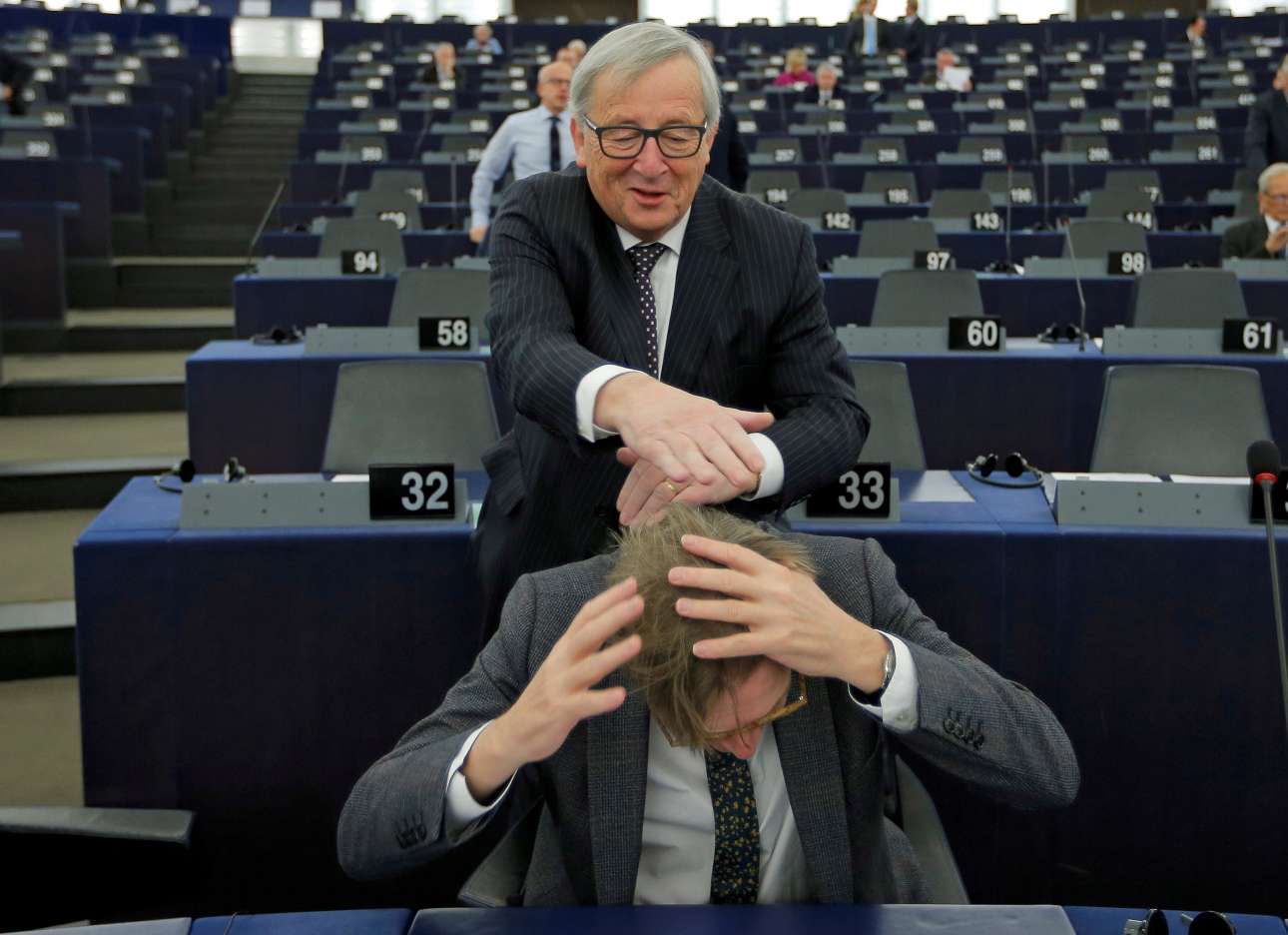 6 Φεβρουαρίου. Ο πρόεδρος της Ευρωπαϊκής Επιτροπής Ζαν-Κλοντ Γιούνκερ αστειεύεται με τον επικεφαλής διαπραγματευτή του Ευρωπαϊκού Κοινοβουλίου για το Brexit Γκι Φέρχοφσταντ, στο Ευρωπαϊκό Κοινοβούλιο στο Στρασβούργο
