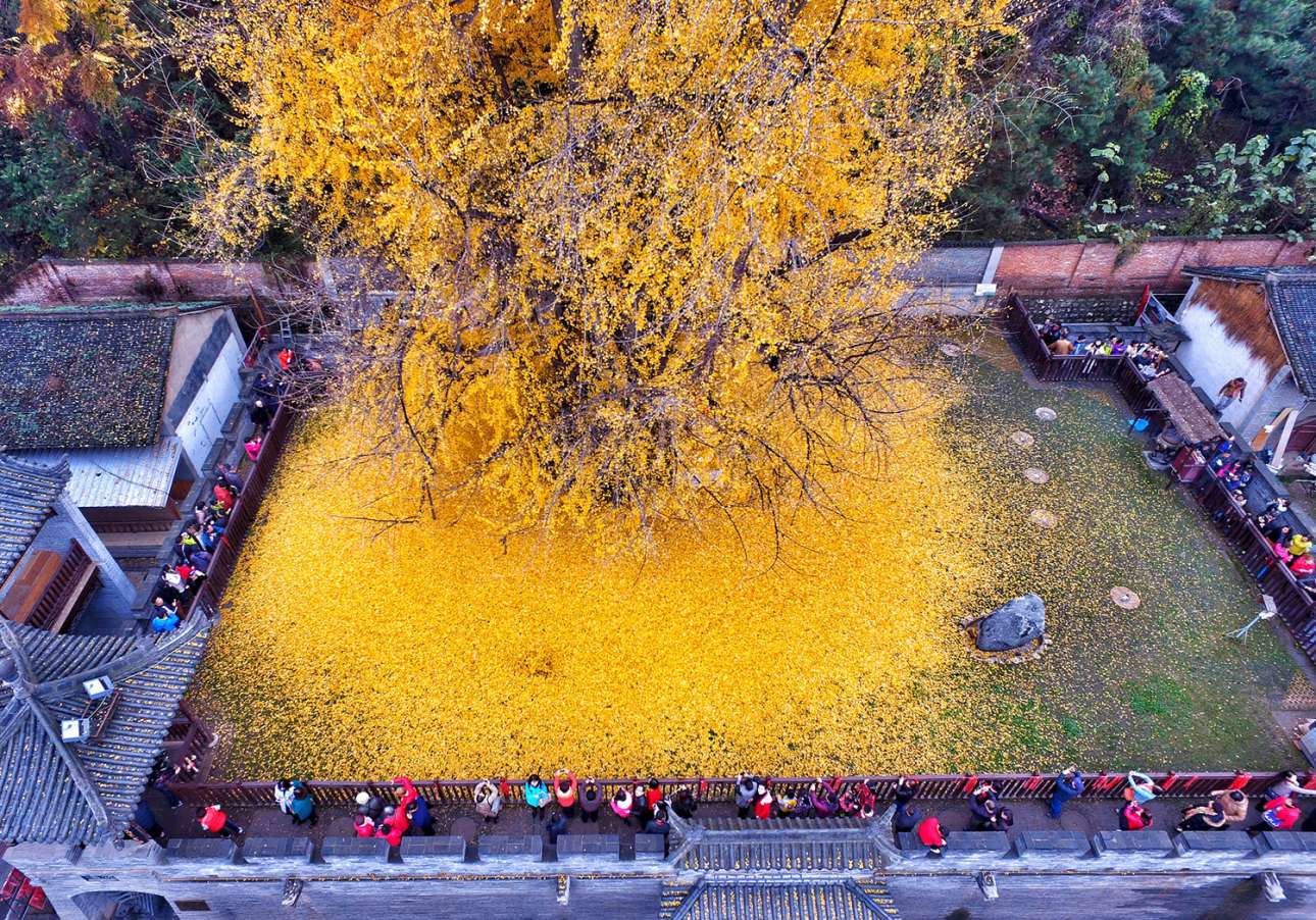 Δεκάδες άνθρωποι φωτογραφίζουν ένα παλιό Γκίγκο που αφήνει τα φύλλα του στην κινεζική επαρχία Σαανσί