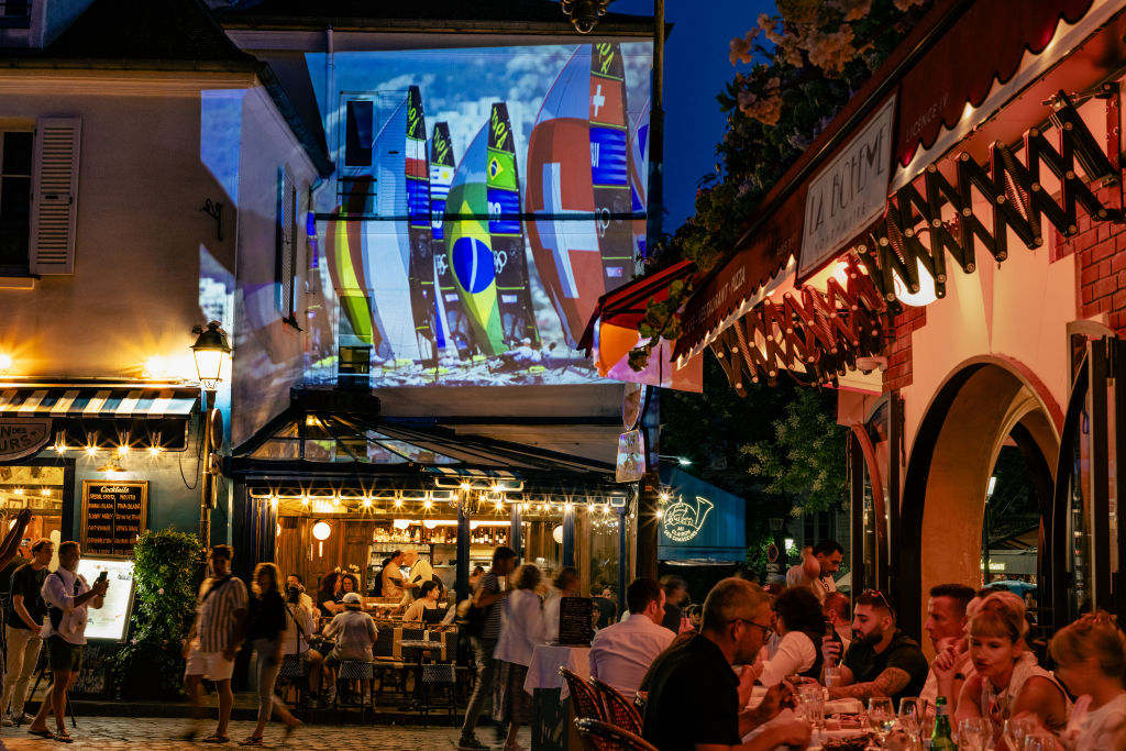 Φωτογραφία του Σκιφ Ανδρών εν δράσει τη δεύτερη ημέρα των Ολυμπιακών Αγώνων Παρίσι 2024, στη Μαρίνα της Μασσαλίας, προβλήθηκε στις 28 Ιουλίου στη Μονμάρτρη στο πλαίσιο των Parisienne Projections